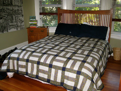 I used Wm Morris print cotton to make this "strip" quilt. Really easy pattern and relatively quick (for a quilt) as you can cut and sew long triple and quadruple strips together before cutting them to patchwork length and sewing them together. There are a few places to get these Morris cottons on web (for instance, The Quilted Fox, Old Trinity Schoolhouse Quilt Shop, or barbarabrackman.com). I used a navy blue flat sheet for backing, added some batting between, then "stitched-in-the-ditch" to pull it all together. The homemade headboard was copied from a similar headboard in the Stickley-Audi furniture store and is made out of cherry and mahogany.