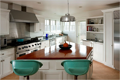 A week or so ago this picture of performance artist Marina Abramovic's kitchen was in the New York Times. Everything was starkly modern but the wooden island made it all seem warm and welcoming. Eighteen months ago I installed wooden countertops during a kitchen renovation (ironically it replaced simulated butcherblock Formica from 70s). I bought two 12 foot lengths of cherry butcherblock unfinished countertops from Lumber Liquidators for $329 each and one 8 foot length for $250. I hired cabinet maker Devon Thibeault, "The Underground Carpenter", to cut them to size including the mitered corner you see below and some complicated cuts around the cabinets on sideboard and around sink. Then I finished the counter pieces (on saw horses in middle of room) with a tung oil product called Waterlox that I can't say enough good things about. I used the Waterlox SEALER/FINISH in Medium Sheen.